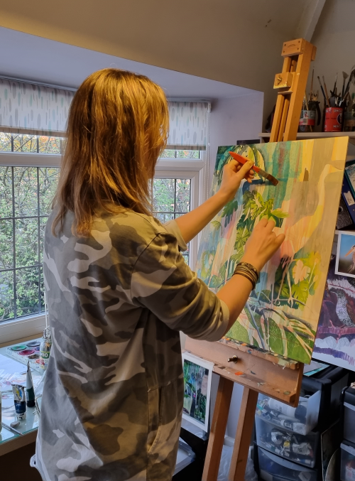 I like to combine abstraction and realism in the same composition; give emphasis to beautiful leaf shapes, and play with negative and positive space. Although I mostly work with a technique of painting in oils over layers of acrylic, I have an instinct to experiment with mixed-media materials and processes such as stencilling and collagraph printing. I often don’t have a definitive vision as to how the finished work will look, but I aim to learn from every artwork; anything which “works” gets taken forward into the next piece and developed and improved.